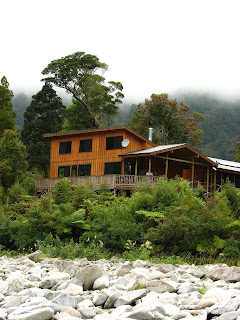I can't take my eyes from the windows. I catch myself just getting lost in the river. The river is wide and blue green in color with white rocks all along. The mountain rage that rises all around us is intimidating. When i thought that I would just climb a mountain on Christmas day to find some snow...I was very mistaken. These mountains are very different from home. They are steep, they rise fast and are very jagged because they are still young. They change all the time. They fall and rise. There are trails leading into the bush all around the lodge. Some follow the river, some wind up the mountains. One thing that you notice as you walk is how tropical the landscape is here. It's very different from home. Very green and tall but totally different plants. Lots of ferns but the trees i don't recognize at all. The other thing that I've noticed is that there are mainly only birds here. There are some rabbits, some rats and possums and that's about it. No other animals. There are seals on the coast and fish, eels, dolphins and such but no other land animals. It's been very cloudy here and rainy but finally today the sun came out.
